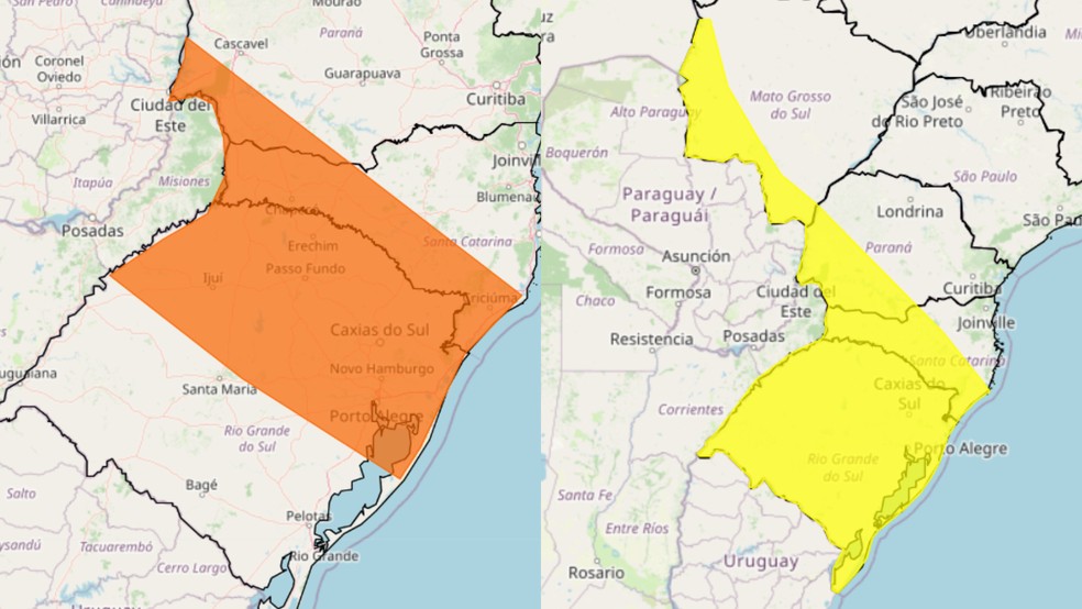 Um alerta laranja,de perigo potencial,também foi emitido nesta sexta-feira para Rio Grande do Sul,Paraná e Santa Catarina (máximas de 15ºC,20ºC e 29ºC nas respectivas capitais). A previsão é de chuva entre 30 e 60 mm/h,ventos intensos e queda de granizo. Também no Sul e em Mato Grosso do Sul,o Inmet prevê para um declínio de temperatura: a expectativa é de que a temperatura caia entre 3ºC e 5ºC. O instituto alerta para "leve risco à saúde" na área afetada. Veja: