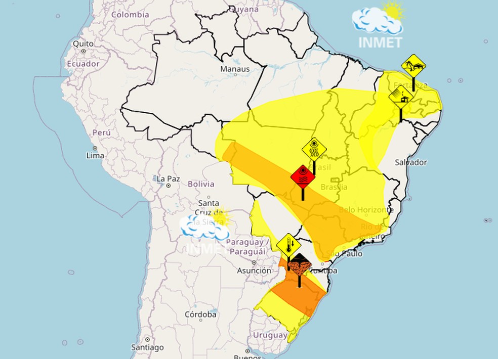 O Instituto de Meteorologia Nacional (Inmet) emitiu um alerta vermelho,de grande perigo,para uma onda de calor em estados do Sudeste e do Centro-Oeste do país nesta sexta-feira. O país ainda enfrenta a onda de calor que bateu recordes de temperatura,e a previsão é de que as temperaturas permaneçam cerca de 5°C acima da média até a próxima sexta-feira. O instituto ainda alerta para vendavais no Nordeste,tempestade e declínio de temperatura no Sul e baixa umidade na parte central do país.