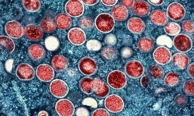Vírus mpox (em vermelho),antes chamado de monkeypox ou varíola dos macacos — Foto: Wikimedia Commons