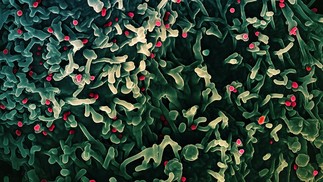 Micrografia eletrônica do vírus da varíola do macaco (vermelho) — Foto: Não informado