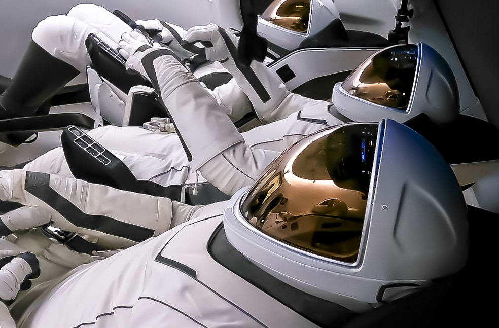 Tripulação da Crew Dragon usa novo traje para EVA,feito pela SpaceX — Foto: Divulgação / SpaceX