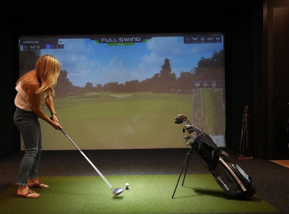 O simulador de golfe do Springline: a transformação de escritórios tradicionais em espaços de trabalho com comodidades semelhantes às de um hotel é designada por “hotelificação” — Foto: Jim Wilson/The New York Times