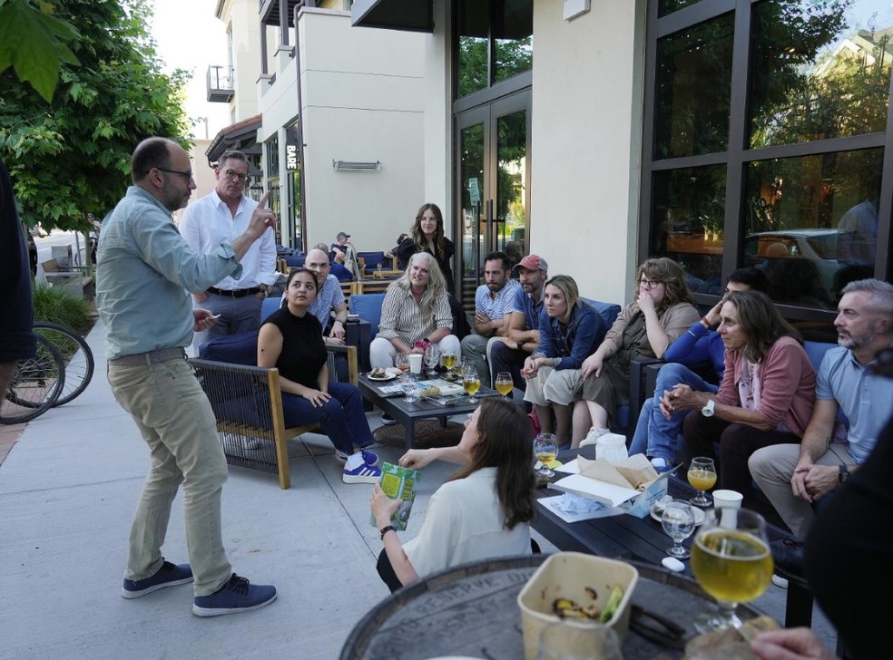Funcionários da Workboard reúnem-se no Bare Bottle,um dos restaurantes do Springline. Na esperança de atrair os trabalhadores de volta,empresas estão criando espaços luxuosos destinados a competir com o conforto e a versatilidade de suas casas — Foto: Jim Wilson/The New York Times
