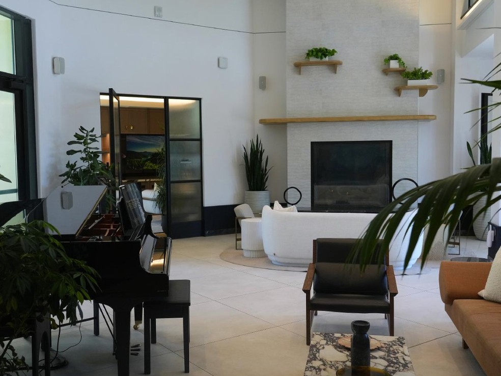 Lobby de entrada do edifício residencial de Springline: visitantes do complexo experimentam uma sensação de conforto e luxo frequentemente encontrada em hotéis de luxo — Foto: (Jim Wilson/The New York Times