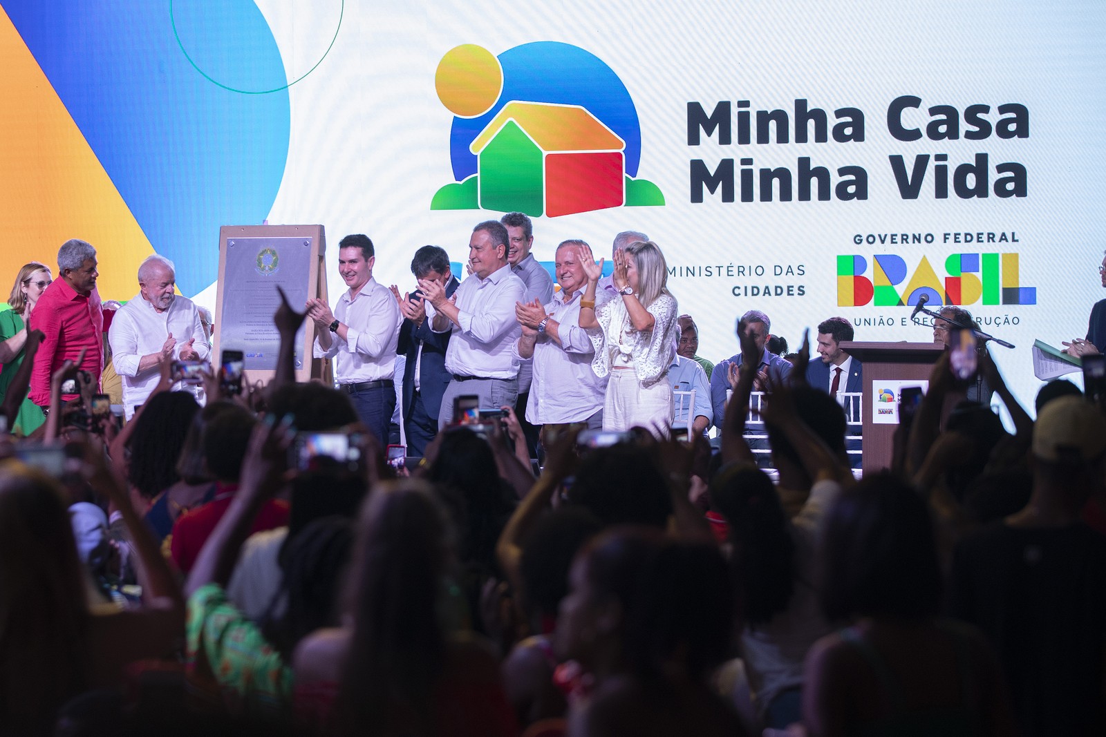 Lula,segundo à esquerda,entrega habitações do Minha Casa,Minha Vida na Bahia com o ministro das Cidades,Jader Filho (à direita da placa): disputa no MDB gera impasse em secretaria — Foto: Joédson Alves/Agência Brasil