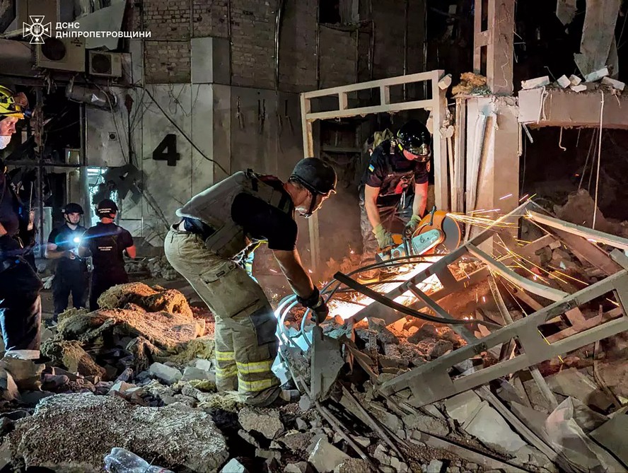 Equipes de resgate da Ucrânia trabalham após hotel ser danificado por um ataque aéreo russo em Kryvyi Rig — Foto: UKRAINIAN EMERGENCY SERVICE / AFP