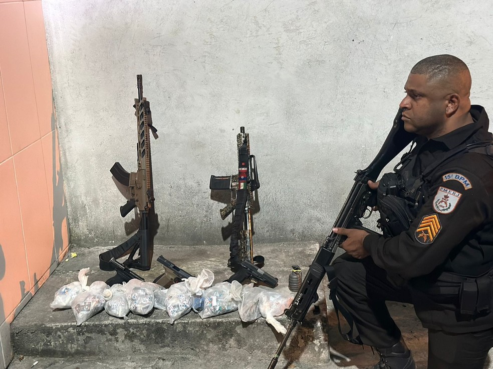 Polícia apreende três fuzis no Complexo da Pedreira em operação conjunta na madrugada deste domingo,após intenso tiroteio — Foto: Divulgação/PM