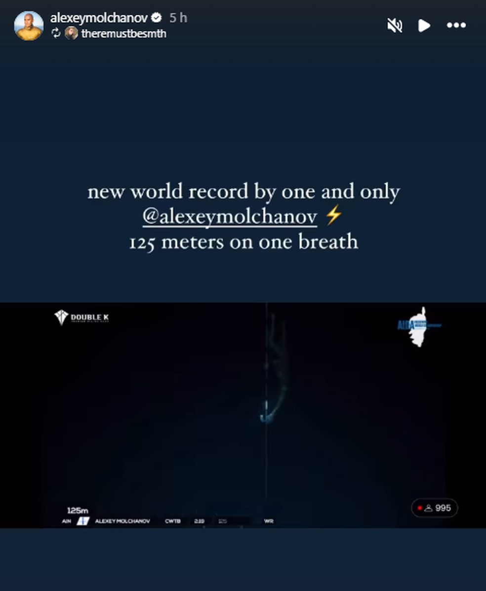 Na época em que perdeu a mãe,Molchanov também já era destaque no esporte. Nesta terça-feira,ele bateu novamente o recorde da categoria CWTB no Campeonato Mundial em Ajaccio,na ilha francesa da Córsega,ao atingir 125 metros,de acordo com a Aida.