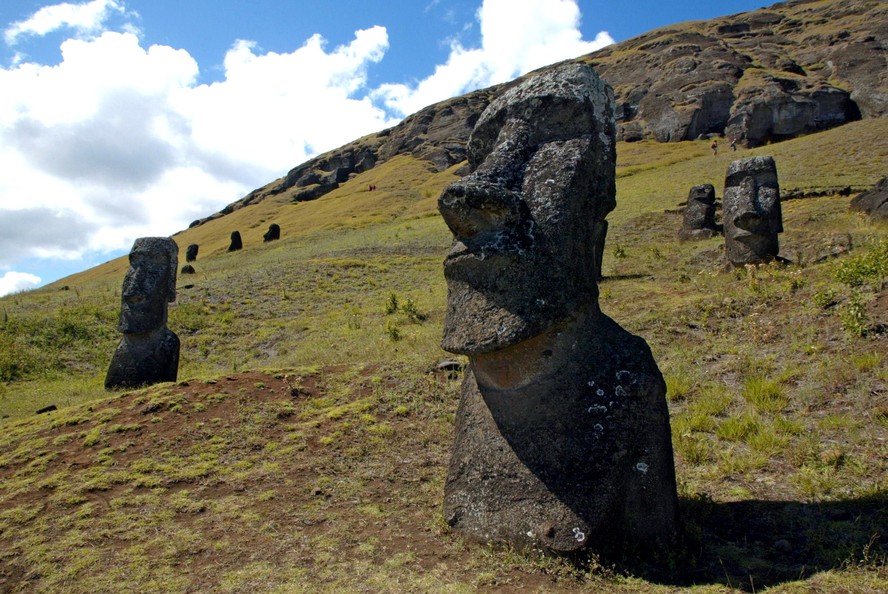 A Ilha de Páscoa,localizada no Pacífico,a 3.700 km da costa chilena,é mundialmente famosa pelas estátuas monumentais esculpidas pelos rapanui,os enigmáticos "moais". Uma hipótese conhecida,baseada principalmente em dados paleoambientais,sustenta que os rapanui teriam desmatado a ilha,que se sabe estava coberta por palmeiras,para manter uma cultura florescente e uma população de aproximadamente 15.000 indivíduos em seu auge.