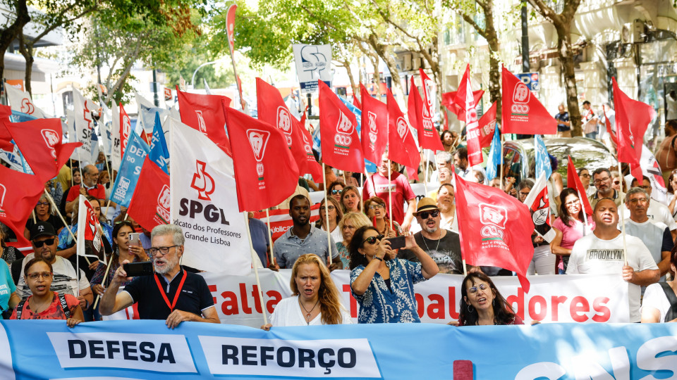 A avenida João Crisóstomo,em Lisboa,está colorida com bandeiras de todos os sindicatos da Frente Comum,promotora do protesto,erguidas por sindicalistas que entoam palavras de ordem como "É preciso investir para a saúde garantir","A saúde é um direito,não é um negócio" ou "A saúde é um direito sem ela,nada feito".