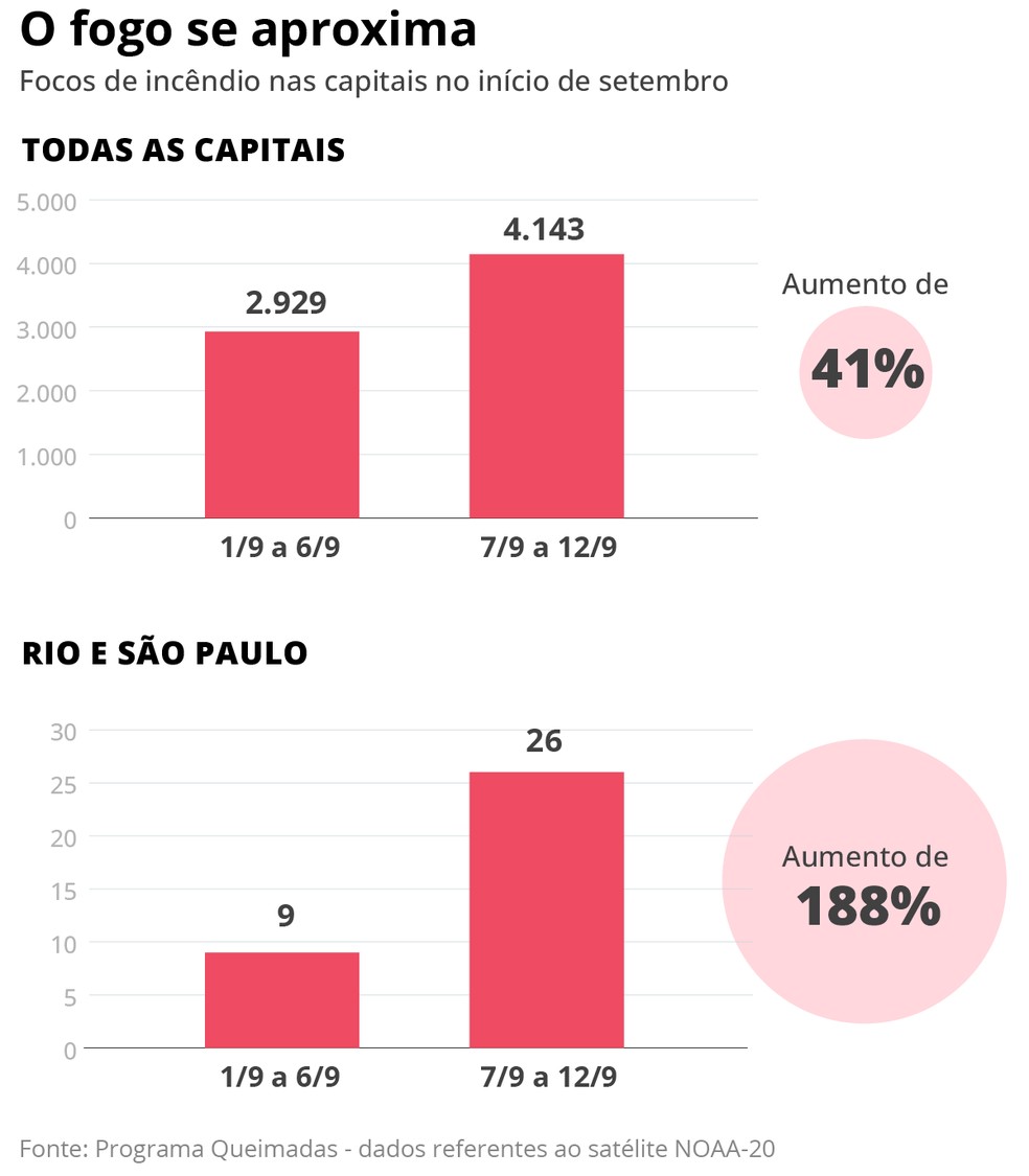 Nas duas principais cidades do país,foram detectados 26 focos de incêndios entre os dias 7 e 12 de setembro. Entre os dias 1º e 6 de setembro,foram nove,quase três vezes menos. O aumento do número de incêndios nas capitais é puxado pelas mais próximas à fronteira do desmatamento. Porto Velho e Cuiabá respondem por quase 6 mil focos no mês.