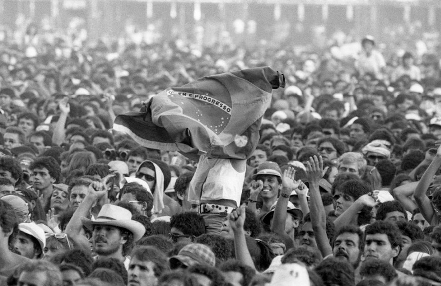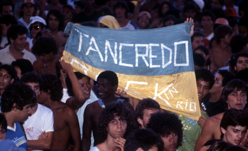 Bandeira para comemorar eleição de Tancredo Neves no Rock in Rio de 1985 — Foto: Frederico Mendes/Agência O GLOBO