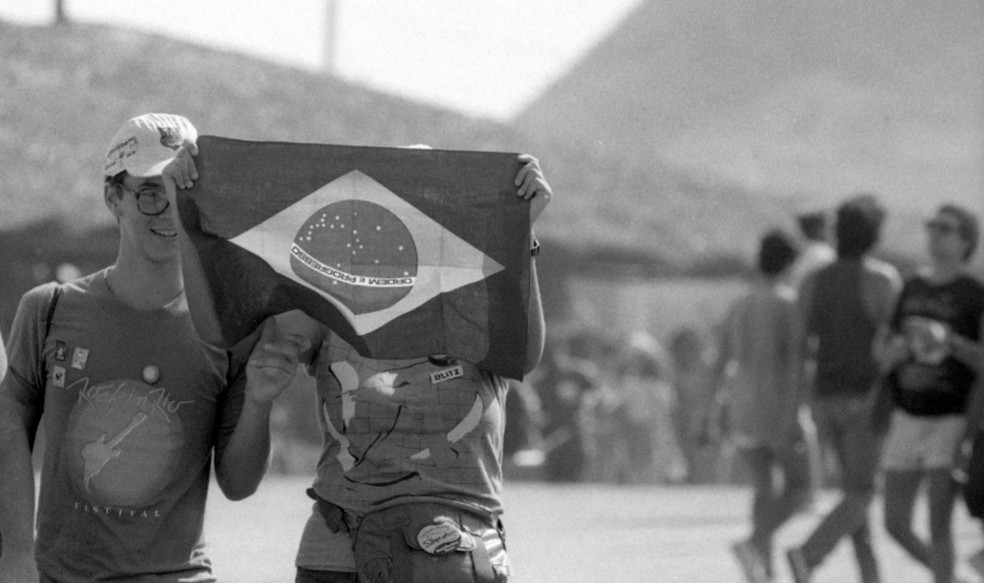 Bandeira do Brasil durante o Rock in Rio de 1985 — Foto: Jorge Marinho/Agência O GLOBO RESUMOSem tempo? Ferramenta de IA resume para você
