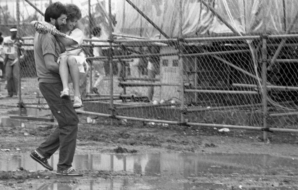 Homem com mulher no colo andando na lama do Rock in Rio em 1985 — Foto: Jorge Marinho/Agência O GLOBO