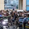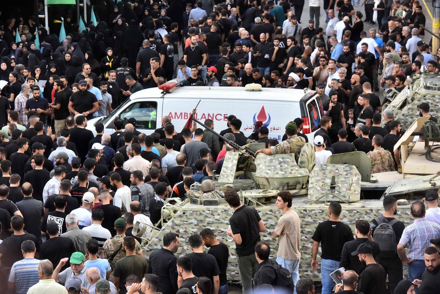 Soldados do exército libanês fazem guarda enquanto uma ambulância chega após a explosão de um pager ser relatada durante o funeral de vítimas do ataque sofrido no dia anterior — Foto: Fadel ITANI / AFP