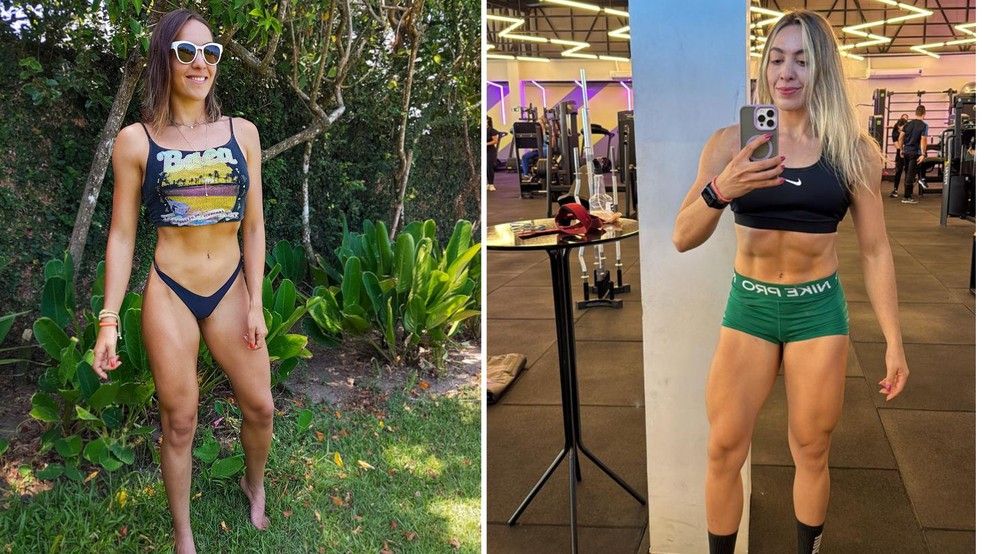 Antes e depois da rotina de exercícios físicos que mudou a vida fisiculturista Débora Pereira — Foto: Acervo pessoal