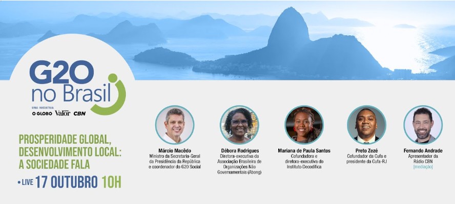 O projeto G20 no Brasil antecipa esse diálogo ao promover live "Prosperidade Global,desenvolvimento local: a sociedade fala,nesta quinta-feira,dia 17 de outubro,das 10h às 11h. A transmissão poderá ser acompanhada pelos canais do GLOBO no Youtube e no Facebook.