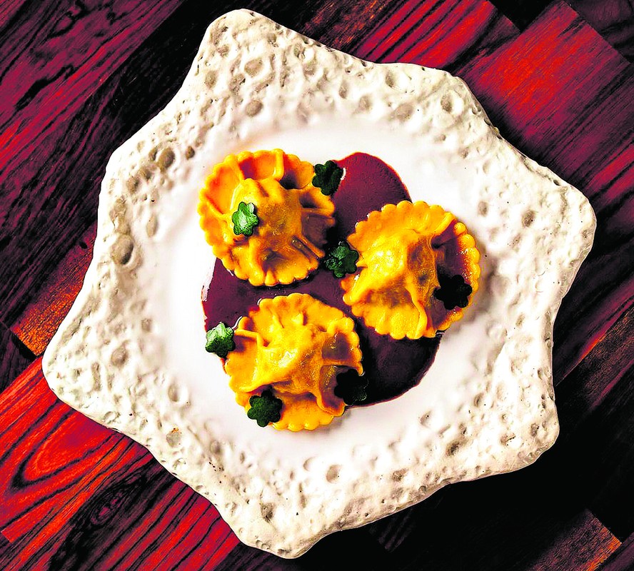 Do restaurante Glouton,ravióli de frango ao molho pardo em massa de açafrão-da-terra — Foto: Divulgação/Kato