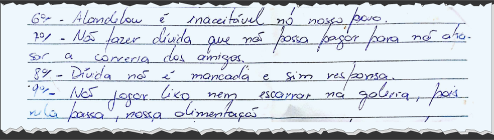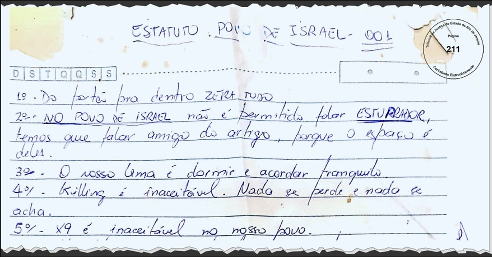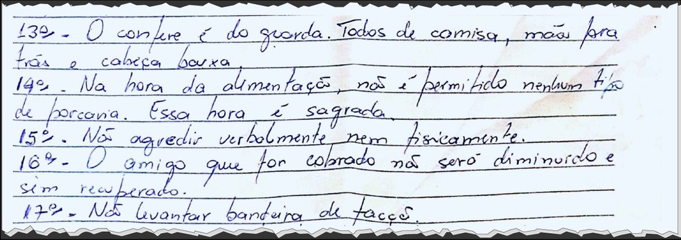 O texto,escrito em papel de caderno à caneta e incluído na investigação da Seap,diz que,a partir da entrada na prisão,o que foi feito lá fora não será considerado. Proíbe usar a palavra “estuprador” (um crime que é condenado por outras facções). E determina que uma dívida deve ser vista como uma responsabilidade.