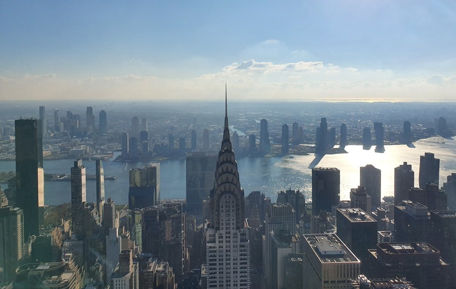 O Chrysler Building,um dos arranha-céus mais icônicos de Nova York,e o Rio East vistos a partir do observatório Summit One Vanderbilt — Foto: Marcelo Balbio / O Globo
