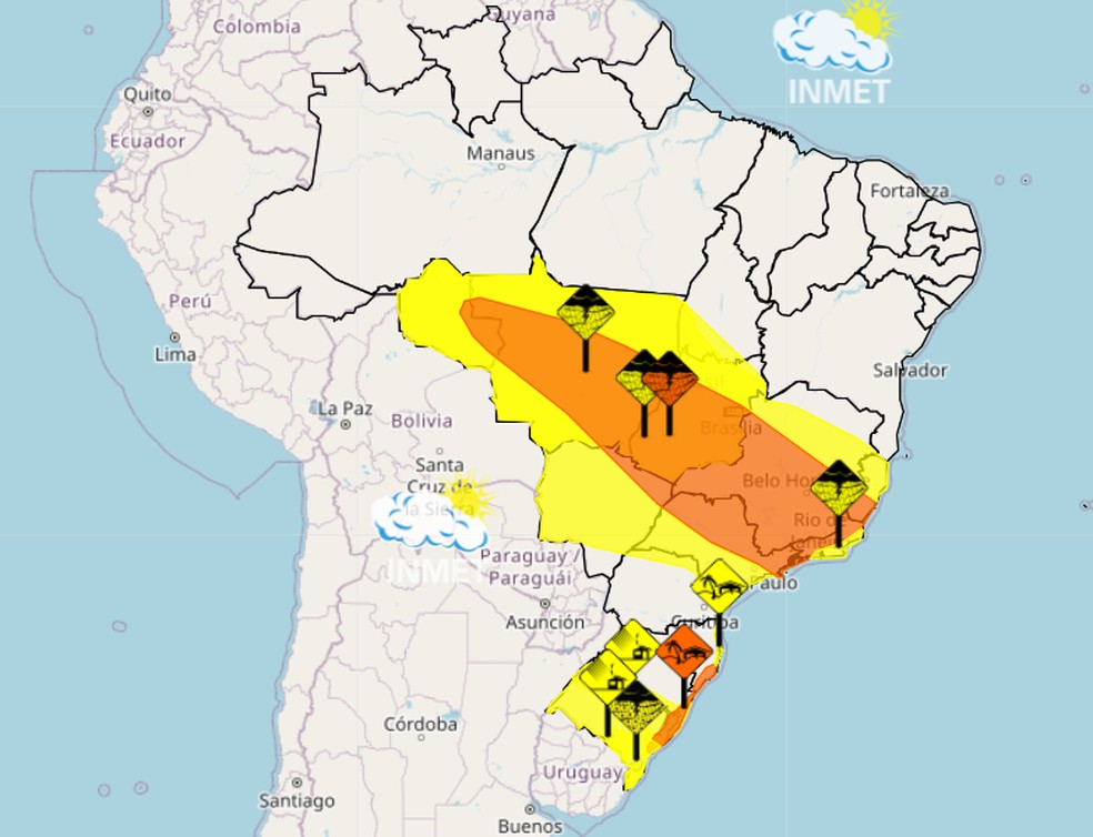 No Centro-Sul do país,12 estados serão atingidos por chuvas intensas ou tempestades neste sábado,segundo o Inmet: Espírito Santo,Goiás,Mato Grosso,Mato Grosso do Sul,Minas Gerais,Rio de Janeiro,Rondônia,Rio Grande do Sul e São Paulo,além de trechos no norte do Paraná e no sul de Tocantins.