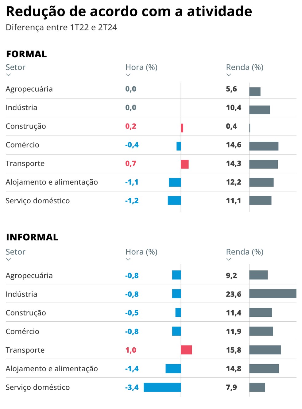 A redução na jornada de trabalho,porém,não vem acompanhada de redução de salários,pelo contrário. Todos os segmentos analisados tiveram aumento no rendimento entre o primeiro trimestre de 2022 e 2024.