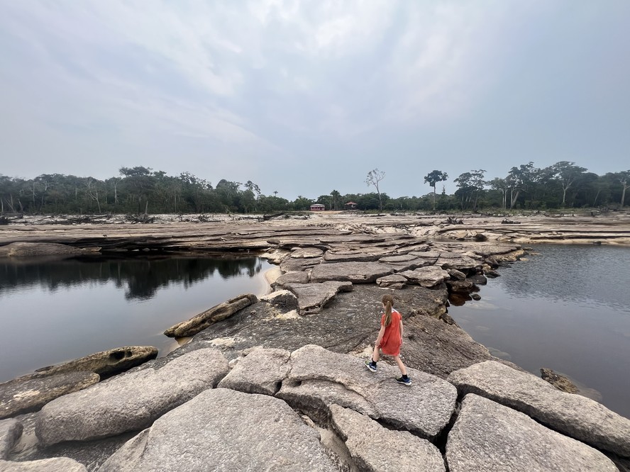 Pequena turista caminha nas pedras do leito do Rio Negro,na altura da comunidade de Madadá,no Amazonas,que reapareceram após período de seca extrema na região — Foto: Ruy Tone / Acervo pessoal