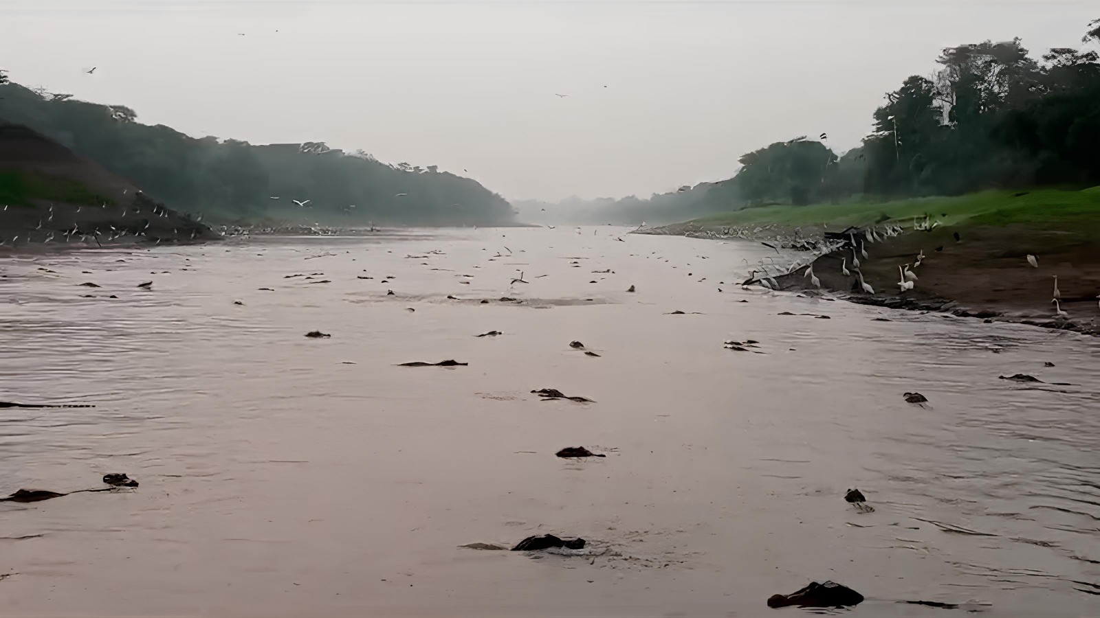 Seca no Médio Solimões faz jacarés se amontoarem onde ainda existe água — Foto: Marcela do Carmo Moraes