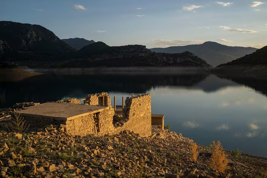 Esta fotografia mostra os restos de uma casa que reapareceu quando o nível do lago artificial Mornos baixou após uma seca,perto da aldeia de Lidoriki,cerca de 240 km a noroeste de Atenas,no dia 1 de setembro — Foto: ANGELOS TZORTZINIS - AFP
