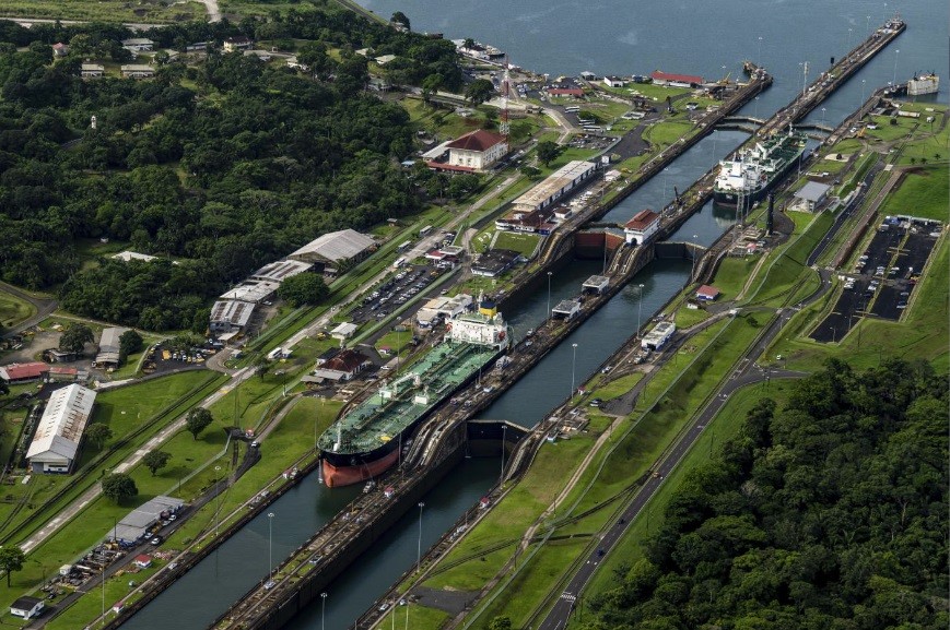 Navios atravessam o Canal do Panamá: a água do lago flui através das eclusas do canal que funcionam como escadas,puxando os navios através do canal — Foto: Federico Rios/The New York Times