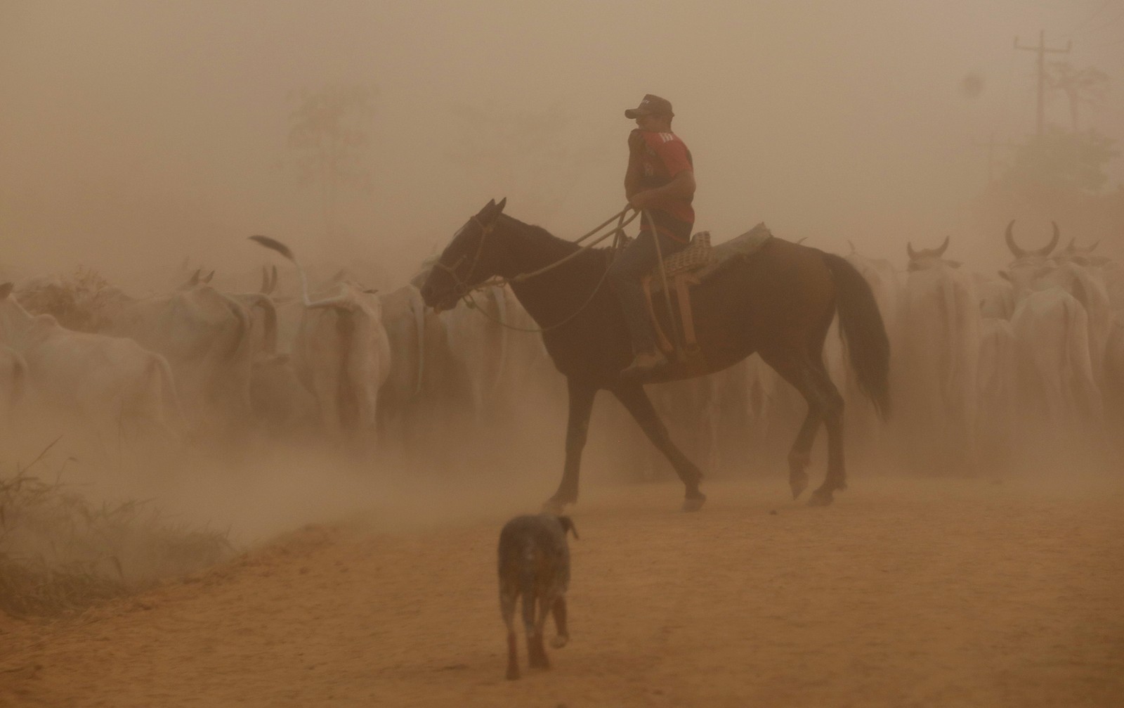 Peão toca o gado na BR 163 (Transgarimpeira),onde a fumaça das queimadas toma conta da paisagem — Foto: Cristiano Mariz / Agência O Globo