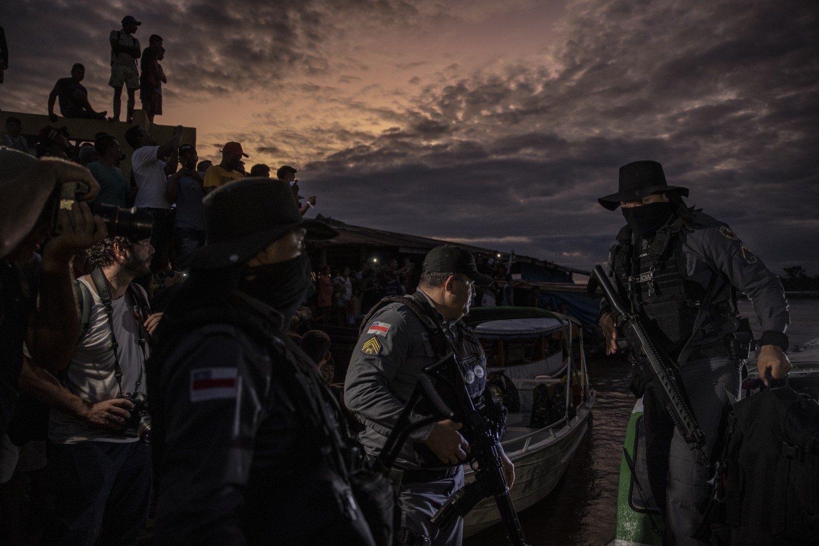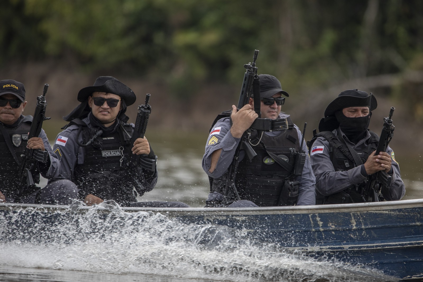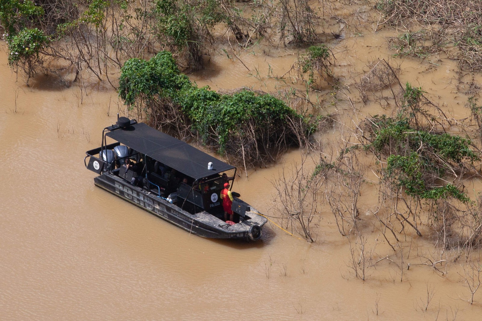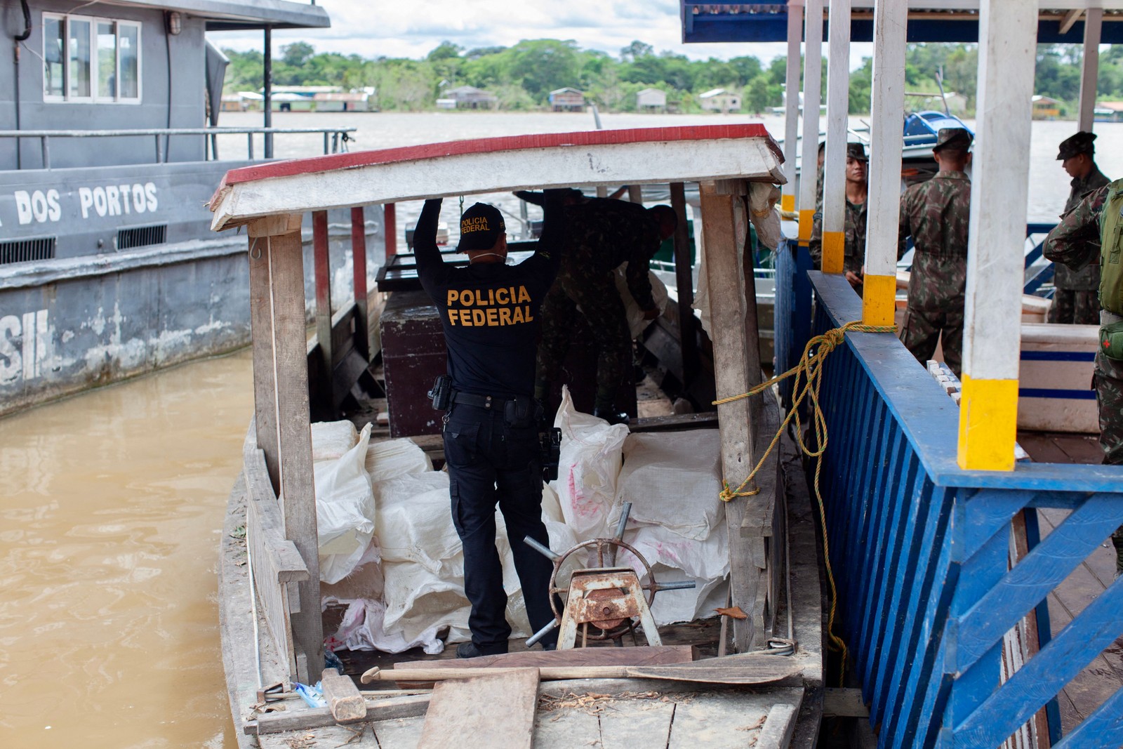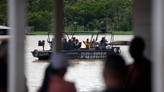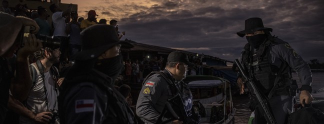 Agentes da PM do Amazonas participam da busca pelos corpos de Dom Phillips e Bruno Pereira,em Atalaia do Norte — Foto: Victor Moriyama / The New York Times