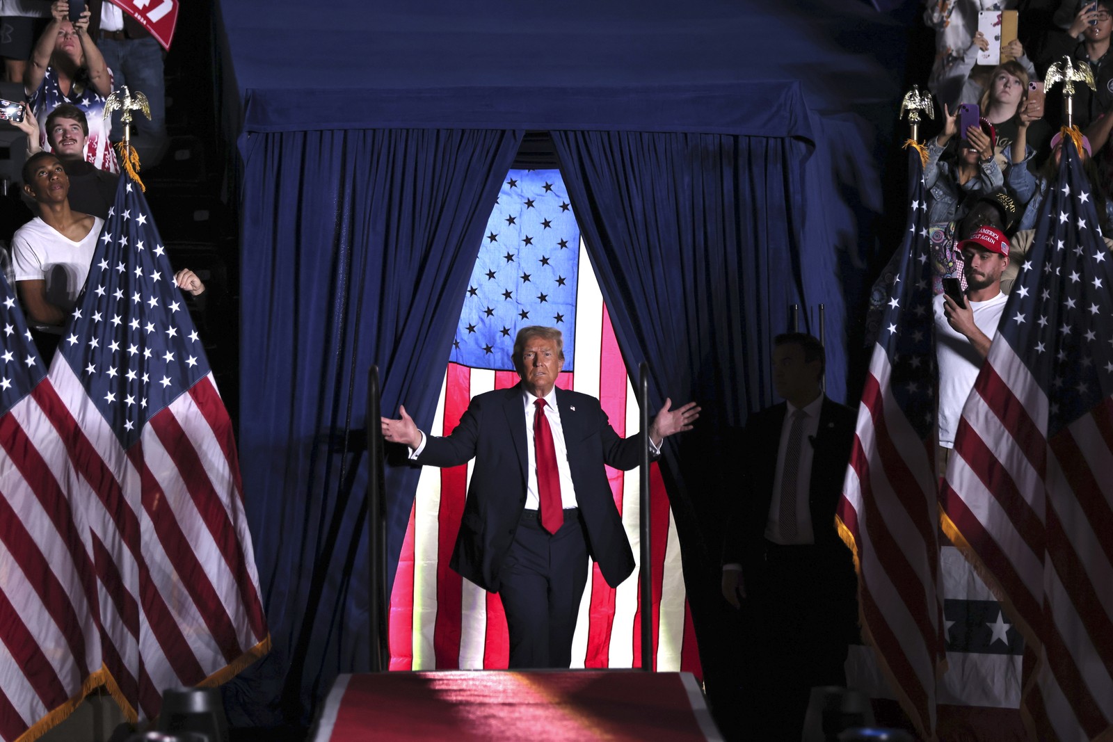O ex-presidente e candidato republicano Donald Trump sobe ao palco durante um comício de campanha na Georgia Tech em Atlanta,em 28 de outubro de 2024 — Foto: Dustin Chambers/The New York Times