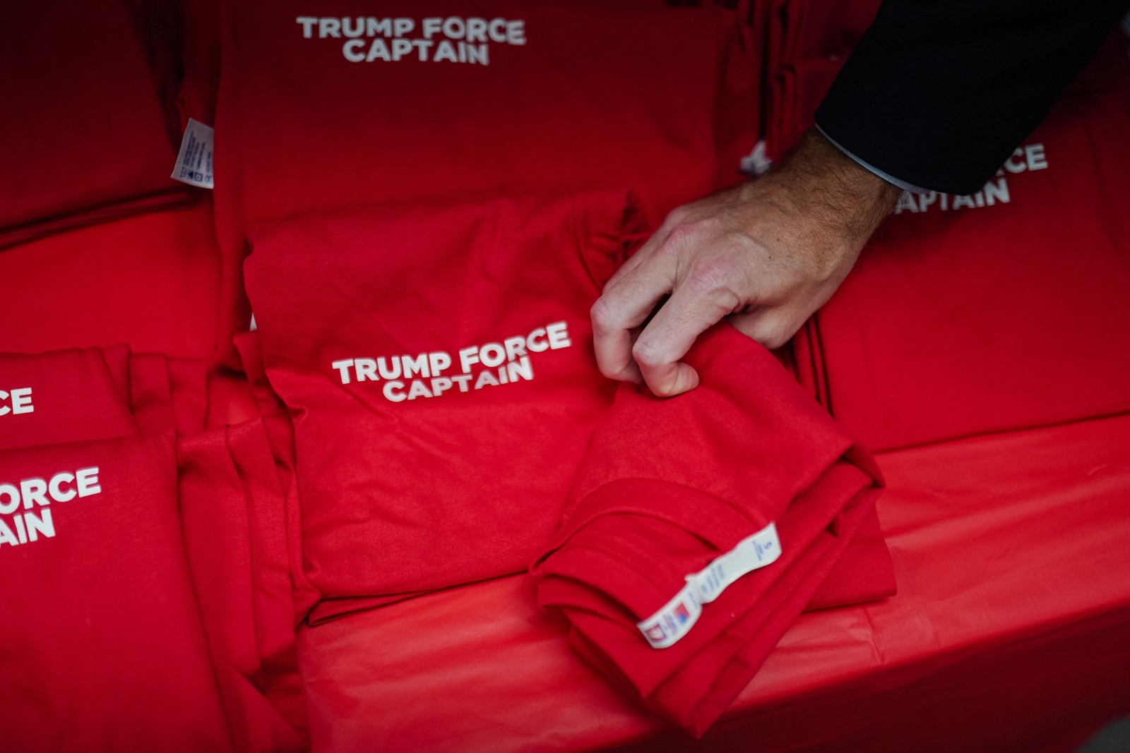 Camisetas com a frase 'Trump Capitão da Força' são distribuídas em evento pró presidente em Atlanta — Foto: Elijah Nouvelage / AFP