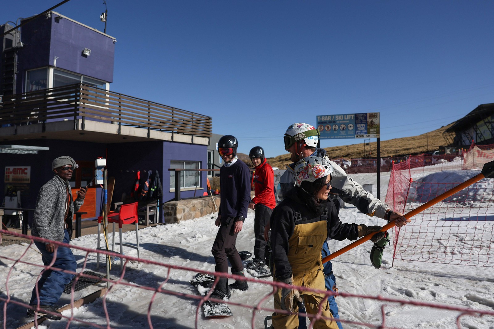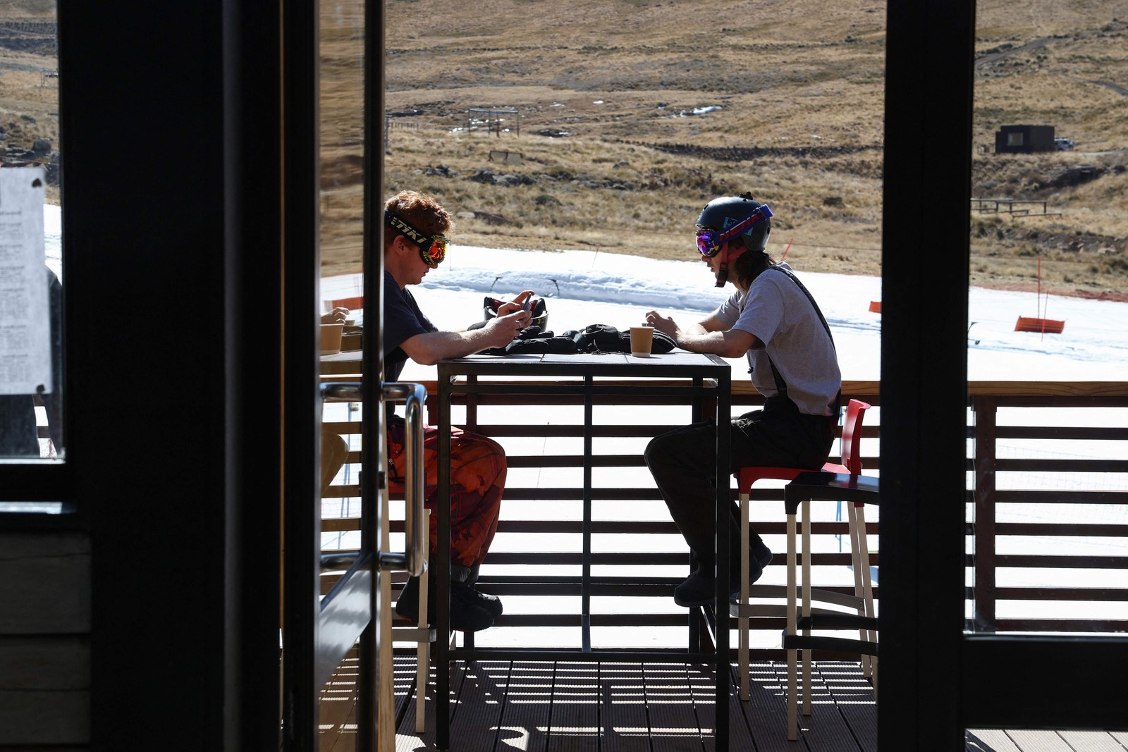 Snowboarders no café da estação de esqui Afriski,no reino africano do Lesoto,que luta contra as consequências das mudanças climáticas — Foto: Phill Magakoe / AFP