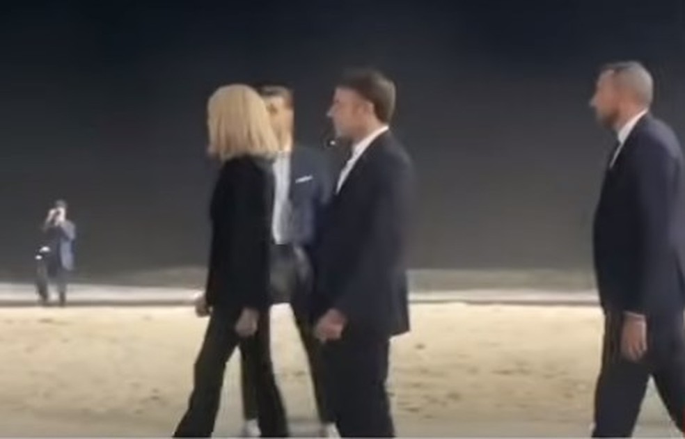 Presidente francês caminhando na orla com a esposa e pequena comitiva — Foto: Reprodução