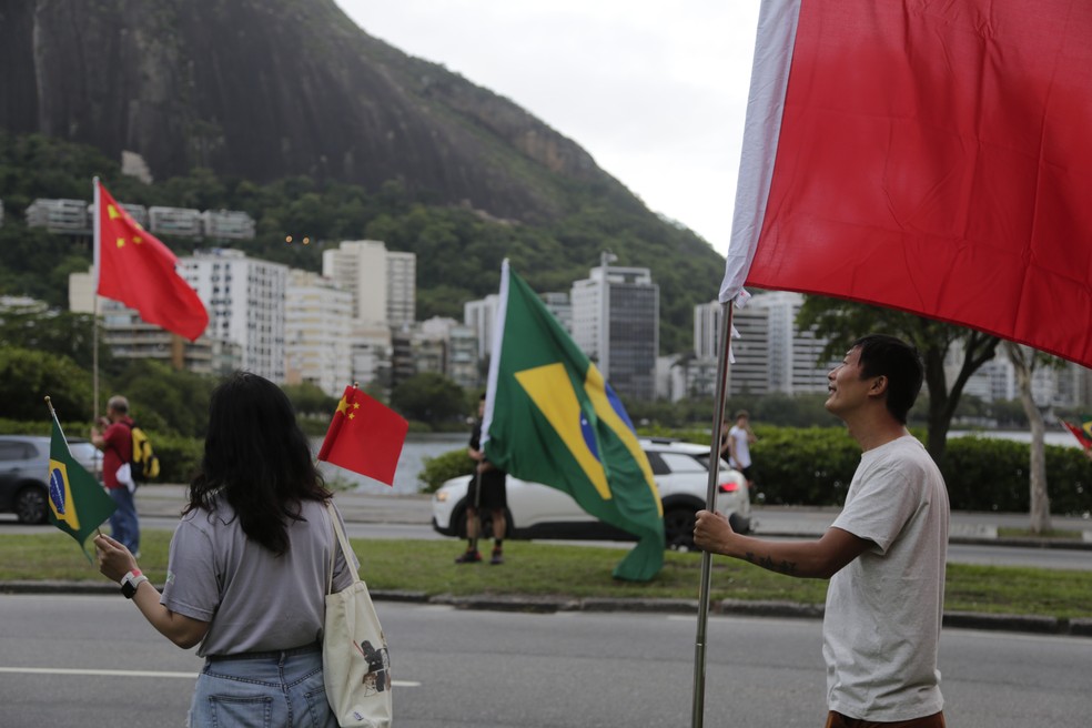 Caravana de chineses na chegada de Xi Jinping no Rio. Eles também estavam nas imediações do MAM — Foto: Alexandre Cassiano
