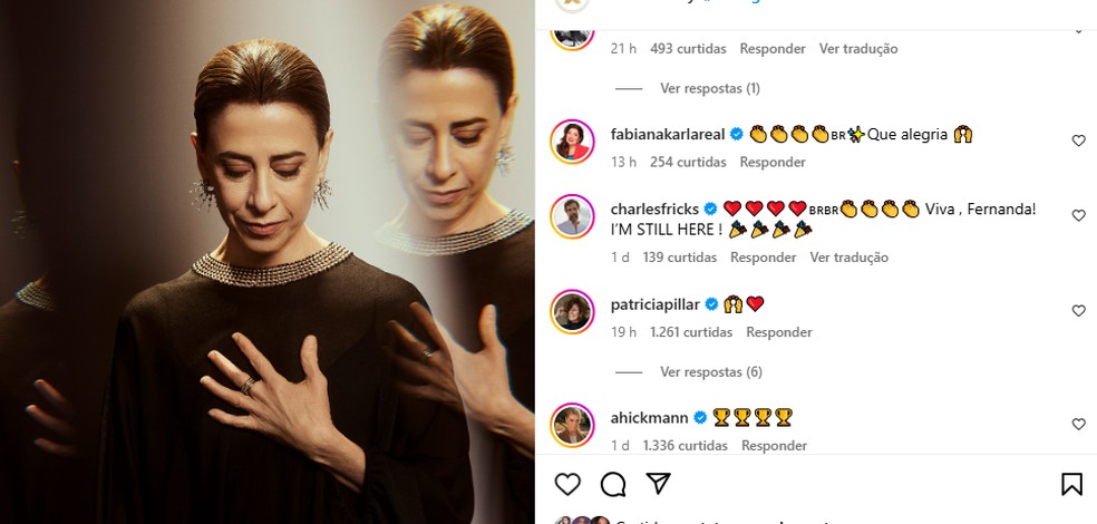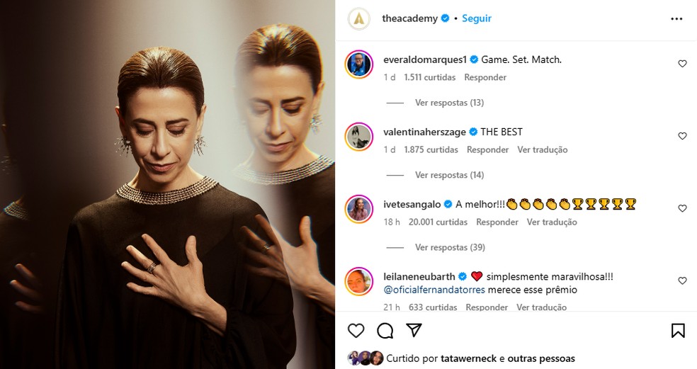 Astrid Fontenelle opinou: "Fernanda Torres no melhor papel de sua carreira". "Vai,Fernanda",torceu Fabio Porchat. "Volta com o Oscar",pediu Isabella Scherer. "Não brinca comigo",afirmou Leonardo Bittencourt,na expectativa de que a indicação se concretize. "Que alegria",comemorou Fabiana Karla. As curtidas na postagem já passaram de um milhão. São mais de 600 mil comentários.