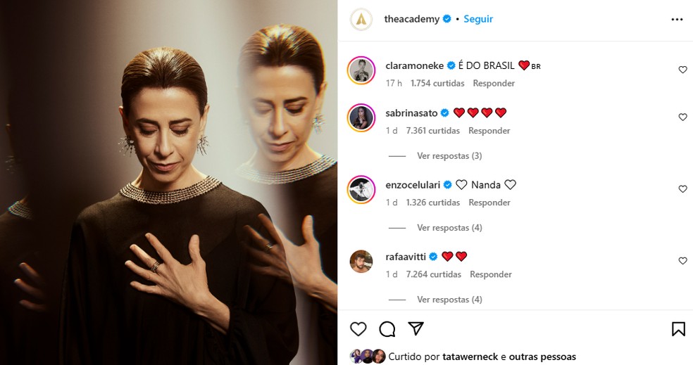 Não são só os anônimos que invadiram o post da Academia do Oscar sobre Fernanda Torres,candidata à disputa por seu magnífico trabalho como Eunice Paiva no filme "Ainda estou aqui",de Walter Salles. Inúmeras personalidades estão na torcida pela atriz e deixaram seu comentário na rede social.