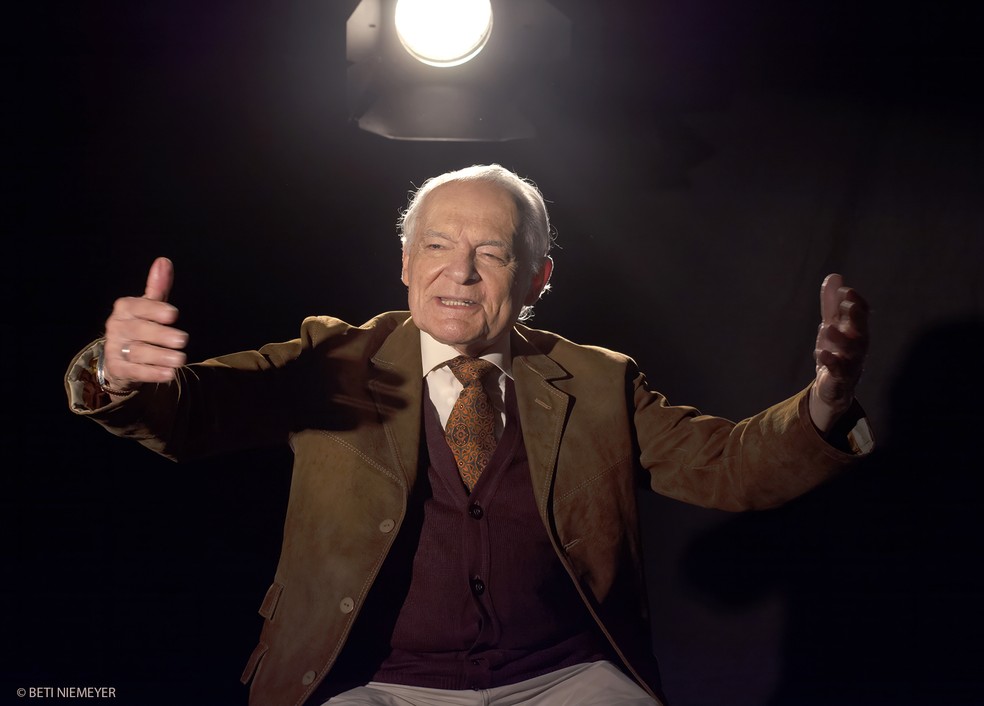 Othon Bastos em seu primeiro monólogo no Teatro Vannucci,aos 91 anos — Foto: Divulgação/Beti Niemeyer