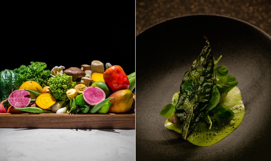 Os dez clientes sentados na bancada voltada para a cozinha aberta (esqueça cheiro de gordura ou comida,não tem nada disso) não sabem o que terão pela frente. A cesta de verduras,legumes e tubérculos,que funciona como um arranjo decorativo,é a única pista do que teremos pela frente. O que está ali,mesmo que irreconhecível,entrará na roda.