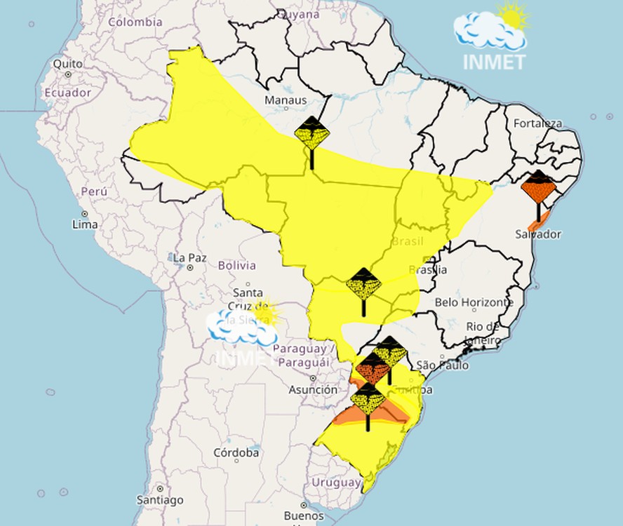 O alerta de tempestades deve atingir do Norte ao Sul do país. Segundo o Inmet,uma faixa que cobre todos os estados desde o Amazonas ao Mato Grosso do Sul deve se manter em atenção para 'Perigo Potencial' com chuvas intensas e tempestades.