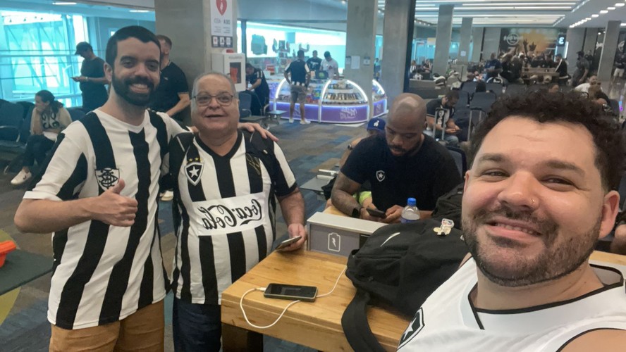 Após voos atrasados e cancelados,botafoguenses Mateus Medeiros (em primeiro plano),seu pai Edvar Maia,e o amigo Daniel Vinagre conseguiram embarcar para Buenos Aires — Foto: Arquivo Pessoal