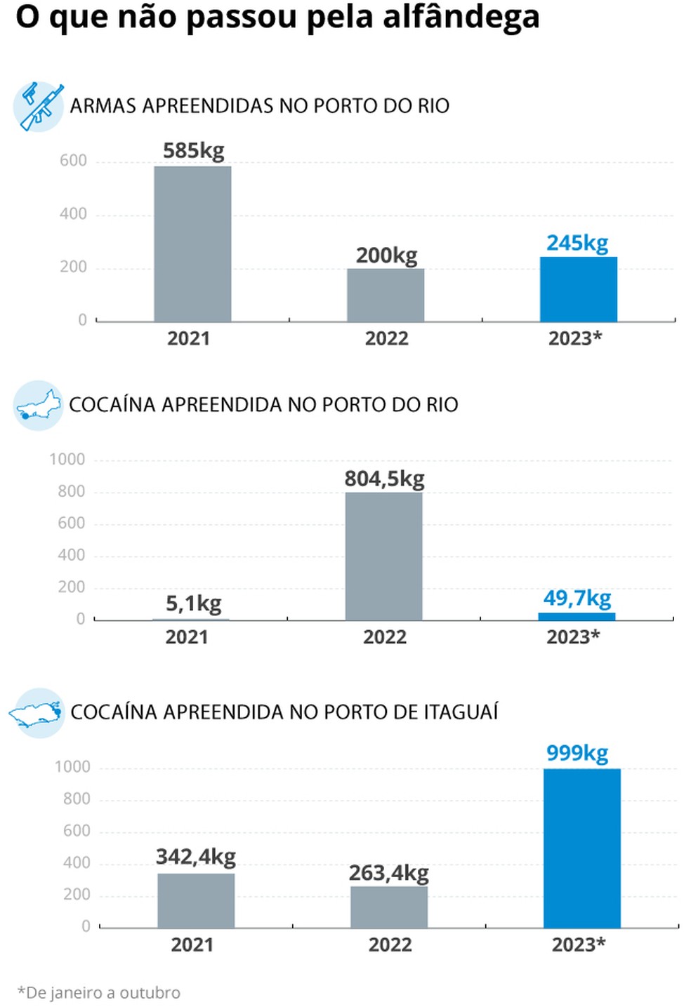 Em quase três anos,de 2021 até outubro de 2023,foram 2,5 toneladas de cocaína encontradas pelo setor de inteligência da Divisão de Vigilância e Repressão ao Contrabando e Descaminho da Receita Federal nos portos do Rio e de Itaguaí. Só de janeiro a outubro,quatro operações descobriram uma tonelada de cocaína em Itaguaí,um aumento de 279% em relação a todo o ano passado. Nesse período,as ações não localizaram contrabando de armamento em Itaguaí. No entanto,no Porto do Rio,foram apreendidas 1.330 armas.