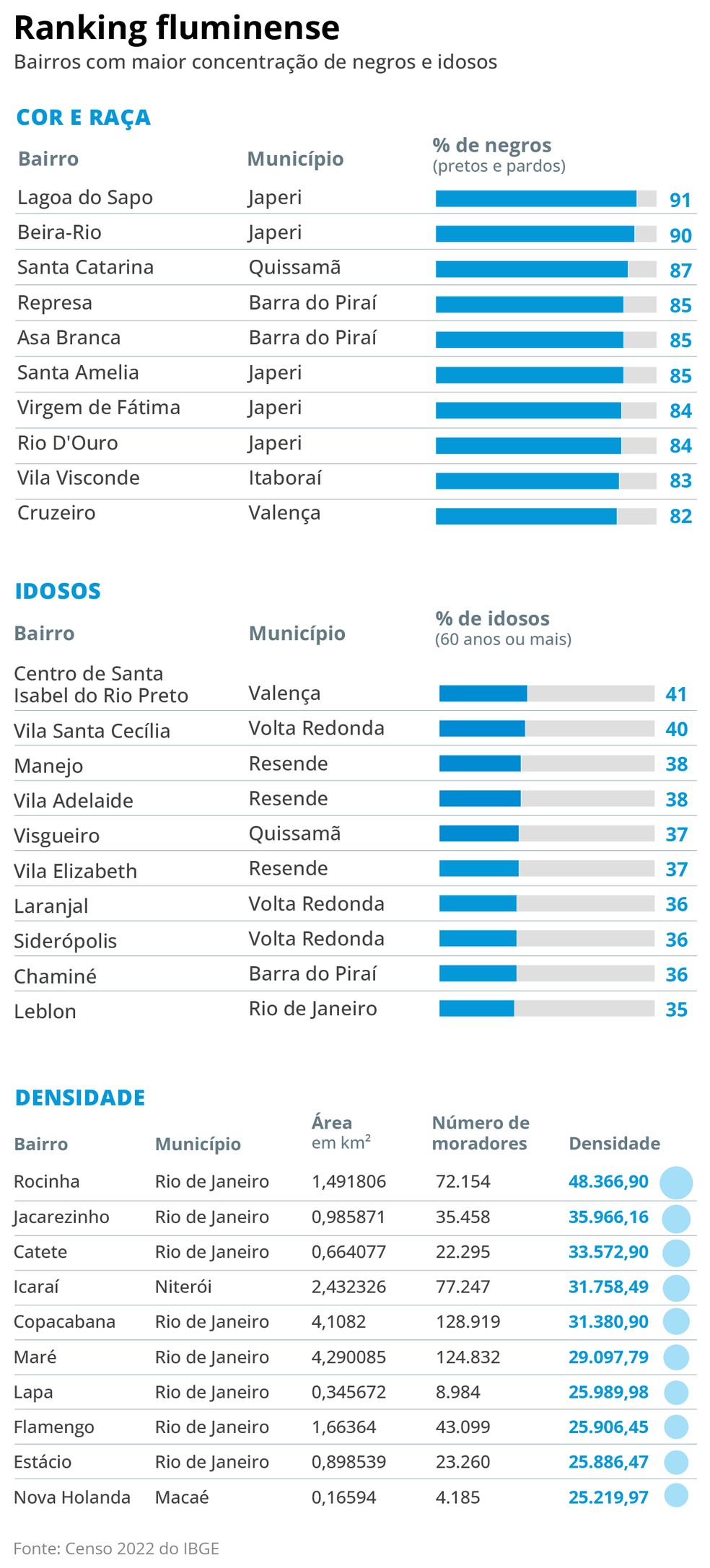 Por bairro,a maior favela do Brasil,a Rocinha,com 48.366 mil pessoas por quilômetro quadrado,é o mais adensado do estado. Mas se engana quem pensa que só a capital e a Baixada têm seus “formigueiros humanos”. A lista tem bairros caros de Niterói,como Icaraí (31,7 mil por quilômetro quadrado). E favelas em cidades do interior que viveram ciclos econômicos impulsionados pelo petróleo ou pela construção naval,como a Nova Holanda (25,2 mil por quilômetro quadrado),em Macaé,e o Morro da Carioca (22,6 mil por quilômetro quadrado),em Angra dos Reis.