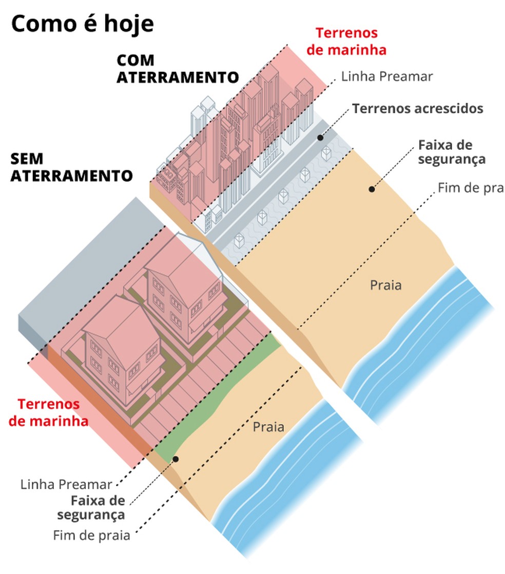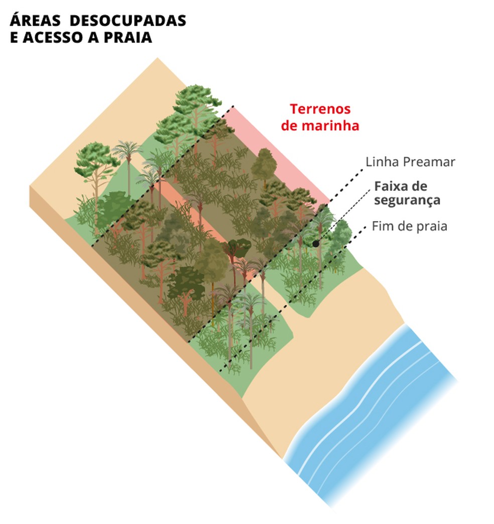 Praia: É a praia como conhecemos,a faixa de areia,que continua sob domínio da união. Faixa de Segurança: Faixa de 30 metros a partir do final da praia (quando acaba areia) para dentro do continente. Dentro da faixa de segurança hoje é proibido um particular ter a propriedade plena de um terreno de marinha. Mas,se estiver fora da faixa de segurança,já é possível a aquisição junto à SPU sob determinadas condições.Terreno acrescido de Marinha: São porções de terras que também pertencem à União e anteriormente eram cobertas pelo mar ou eram mangues e canais que foram aterrados após a demarcação da Linha de Preamar Média (LPM),em 1831. Um exemplo é o Aterro do Flamengo. Terreno de Marinha: Área criada para proteção da soberania nacional na época do Império. É uma faixa de 33 metros para dentro do continente a partir da Linha de Preamar Média (LPM),que considera as marés máximas de 1831. Esse ano foi tomado como referência para dar segurança à demarcação,pois,considerando o avanço das marés ao longo dos anos,o Terreno de Marinha poderia aumentar cada vez mais. Além da costa,a faixa de 33 metros serve para margens de rios e lagos que sofrem influência do mar.