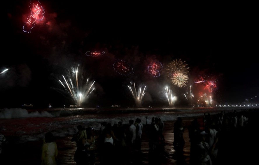 Durante a queima dos fogos,drones desenharam várias imagens na chegada de 2024 — Foto: Gabriel de Paiva/Agência O Globo