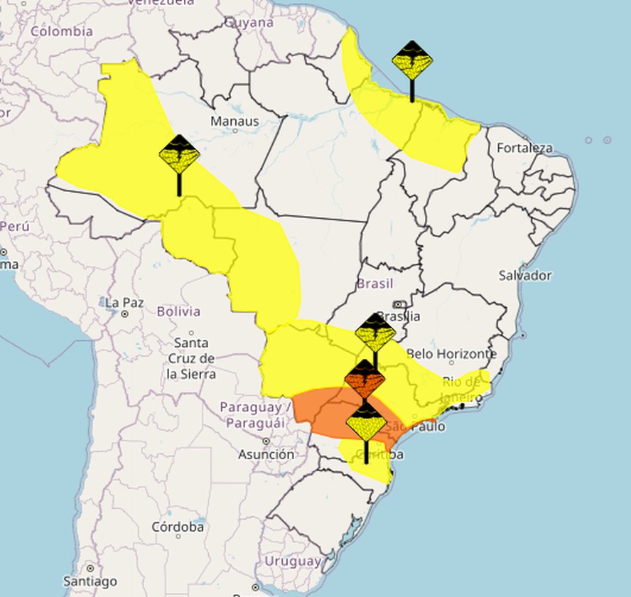 Marcados pelo aviso de "Perigo Potencial" devido às chuvas intensas estão os seguintes estados: Amapá,Amazonas,Espírito Santo,Goiás,Maranhão,Mato Grosso,Mato Grosso do Sul,Minas Gerais,Pará,Piauí,Rio de Janeiro,Rondônia e São Paulo. A perspectiva é de ventos intensos,baixo risco de corte de energia elétrica,queda de galhos de árvores,alagamentos e de descargas elétricas.
