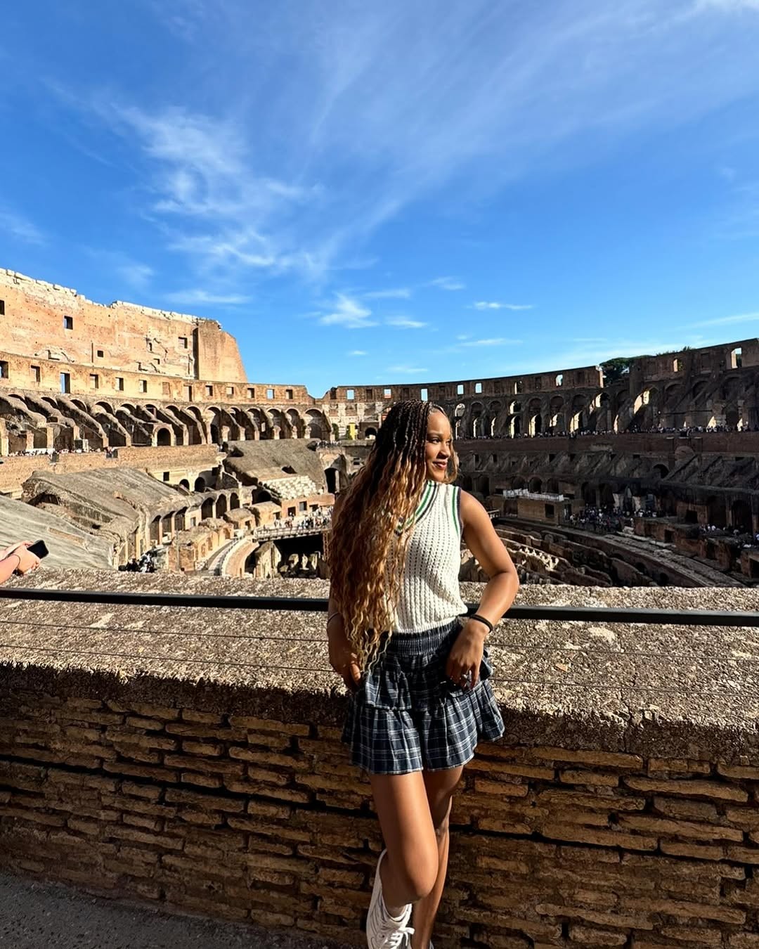 Rebecca Andrade usou um suéter e uma saia xadrez estilo colegial em viagem para Roma — Foto: Reprodução/Instagram