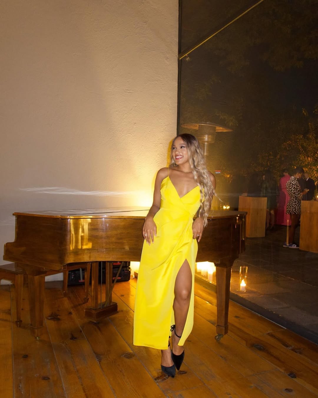 Rebecca Andrade ousou ao escolher um vestido sexy amarelo bandeira no estilo sereia com uma fenda longa e um decote cavado — Foto: Reprodução/Instagram